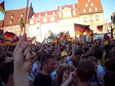 Bei uns am Marktplatz war ja ne große Leinwand aufgebaut, dass fand ich echt toll. Aber was seltsam war, die hatten Security da, warum auch immer........ich musste mein Getränk in der Plastikflasche austrinken, da ich sonst hätte wegschmeißen müssen ?? -.- Und die Leute sind umgefallen wie die Fliegen. In meinem Umkreis hatten bestimmt 3 Leute nen Kreislaufzusammenbruch oder sie haben so viel Alk getrunken, dass ihnen schlecht war.